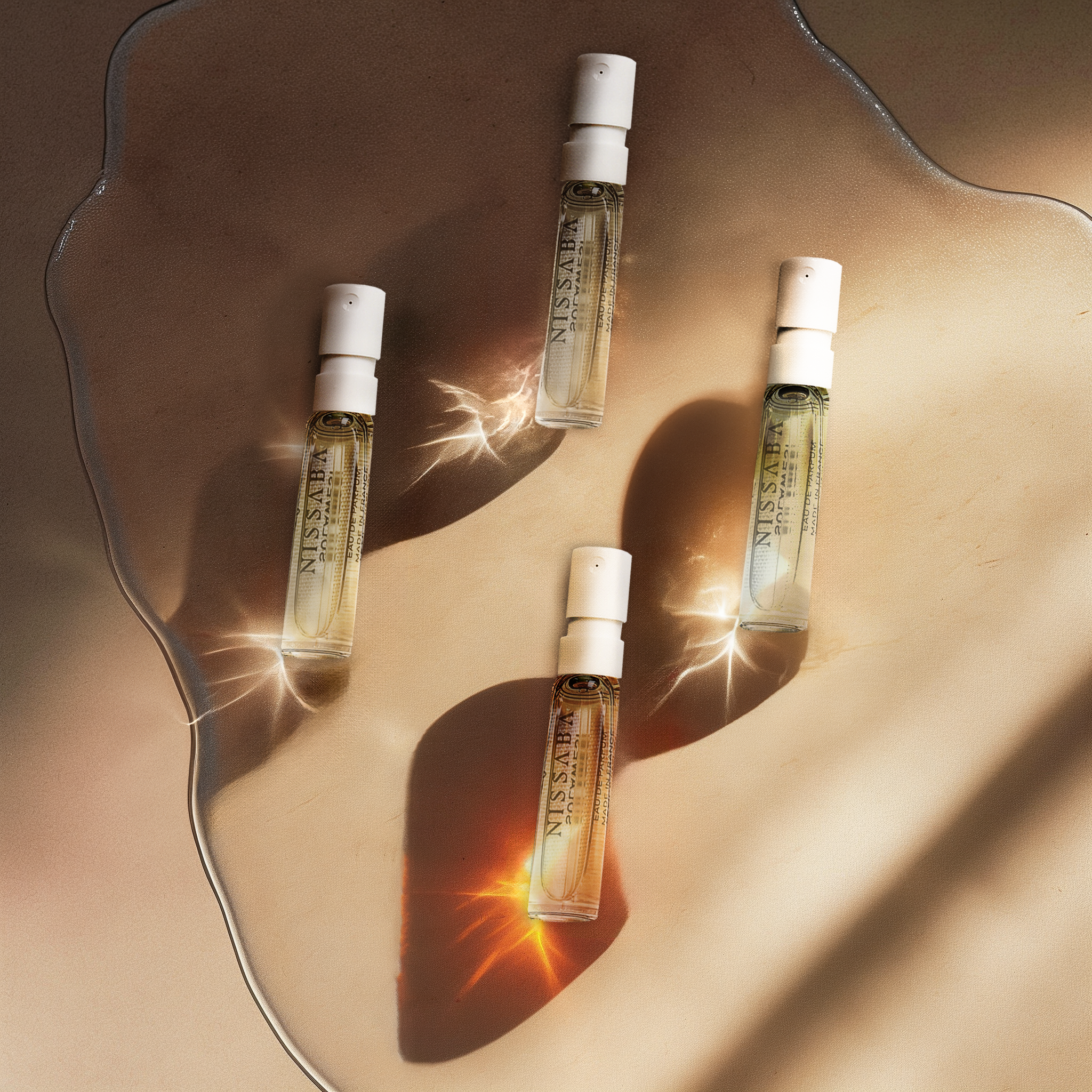 Try the fragrances on your skin. Feel the inspiration as you think of these lands around the world celebrated by Nissaba.